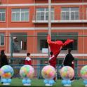 首先进行的是一二年级的羊角球比赛。随着一声哨响,小选手们快速地向前行进。只见她们双手紧握羊角,弯着腰,小脚灵活地控制着弹跳的羊角球。