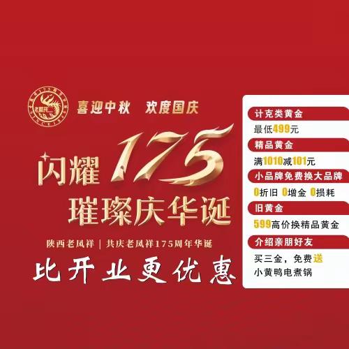 老凤祥璀璨175周年,喜逢中秋国庆佳节,喜上加喜,感恩大回馈,三节盛惠,钜惠无限🎉🎉